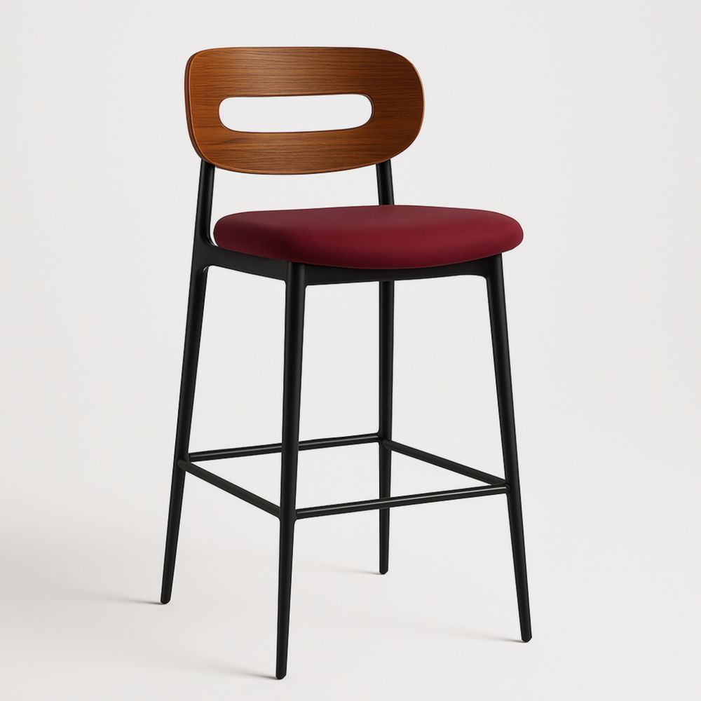 Sgabello da bar in metallo nero con seduta bordeaux e schienale in legno